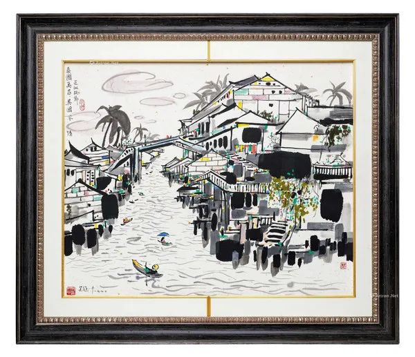 吴冠中的水墨创作在二十世纪九十年代初进入一个创作盛期。“水乡系列”是实现其艺术理念的核心题材之一。在繁与简之间探索着一种极富视觉张力的绘画表现形式。1990年7月,吴冠中作为中国美术家代表团的副团长赴泰国参加《中国当代美术家画传》的发行仪式。在泰国逗留的短暂时间里,吴冠中创作了一批写生作品,这批画作数量不多且极具东南亚地域特色与异国风情,属于画家创作序列中的罕见题材,1990年创作的《泰国水乡》即为其中之一。