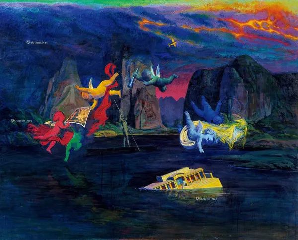 创作于1993年的《巴洛克》一如其名,即是对巴洛克风格的戏仿。巴洛克风格的艺术单纯而富有激情,提倡回到古典,在文艺复兴庄重宏伟的风格基础上融合了样式主义的夸张与想象力。在《巴洛克》中,画家首先对作为 “环境”出现的风景部分进行了严谨而细腻的描绘:巍峨的山峦,幽深的水面,浓云密布的天空以及瑰丽的天光共同为画面营造出一种凝重而又充满奇幻色彩的末日氛围。