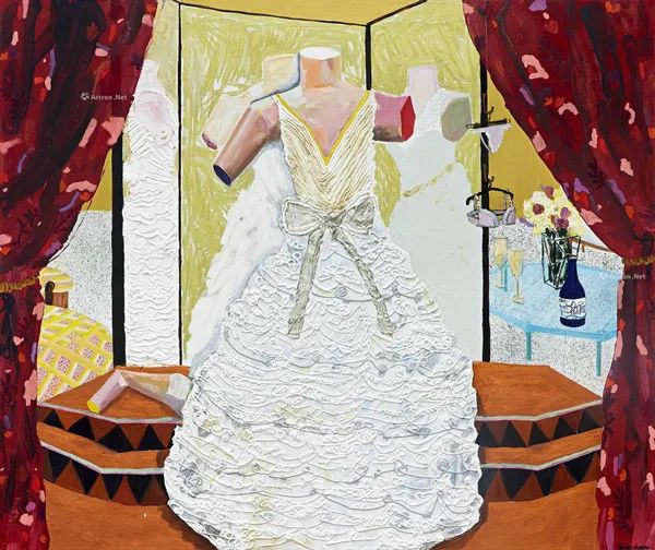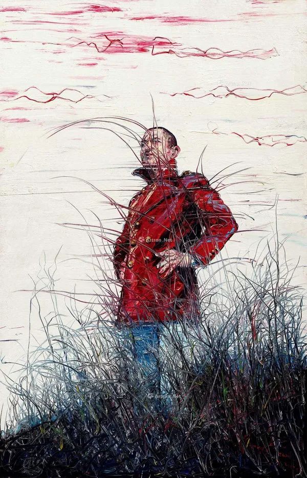 自画像是艺术家曾梵志创作中非常重要的题材。从22岁对着镜子画出了一幅让自己满意的自画像作品之后,在人生的每个重要阶段,艺术家都有强烈的欲望描绘自画像。创作于2006年的《自画像》是曾梵志“乱笔”时期的作品。在《自画像》中,画家以略带仰视的视角描绘了隐藏在荆棘丛中的自己——一袭红衣,极目远眺,神情自若,仿佛正回首过往,颇有“人事有代谢,往来成古今。江山留胜迹,我辈复登临”的感怀与喟叹。同时,为了打破常规肖像绘画的固定范式,他在画面中引入了“乱笔”这一极具形式意味的变量元素,通过对笔触肌理、画面结构及图像构成等多个维度进行破坏与重构,最终形成破局,为其肖像绘画赋予了全新的美学意义。