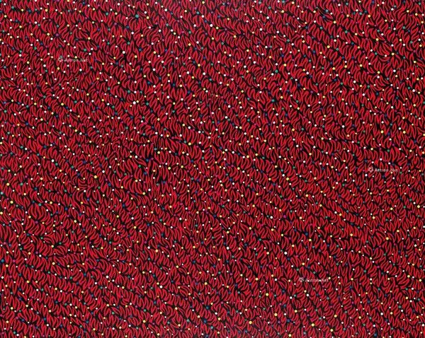 本季上拍的草间弥生的作品《上天的启示》创作于2004年,这幅作品是该系列中罕见的大尺幅杰作,画面中充斥着不断扭曲且无限延伸的红色线条,其间点缀白色、黄色、绿色的波点,仿佛一个无所逃遁的视觉迷宫,在几何的符号交织中寻求来自上天的启示,而这一独特的视觉风格无疑与草间弥生直接的生存经验密切相关。由于童年特殊的家庭环境,草间弥生自幼便患上了精神疾病,即神经性视听障碍及精神分裂症。自那时起,她就时常被大量出现的幻觉所困扰。于是,“网”与“波点”便成为了她的另一个自我与取之不尽的艺术灵感之源。从最初遍布的空心圆再到网纹与圆点的闭合模式,草间弥生在二维的平面世界中建构出一个无限延伸的符号空间,宣泄着真实而赤诚的生命体验,令观者不由自主地沉浸其中。