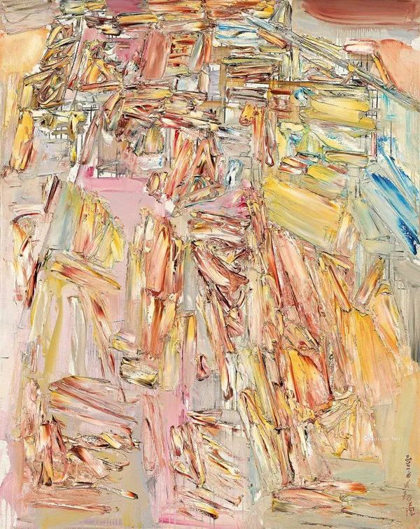 九十年代是吴冠中抽象绘画的转折期,自1983年提出“风筝不断线”的观点后,他开始进一步在油画中进行本土化探索,将水墨画的写意元素渗透入以油彩为媒介的表现中,用几何块面和丰富的色彩表达独特的视觉美感或某种情绪,在东西方两种截然不同的美学中游刃有余地穿梭,架起了沟通的桥梁。