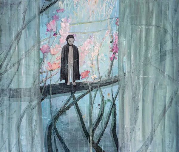 在刘炜的创作中,风景系列的创作手法非常多样,其中一部分吸收了中国传统山水画的造型元素,将“山水”所承载的固有文化含义进行现代性解读,或许是受到格哈德·里希特的启发,以灰色渲染创造出朦胧暧昧的视觉效果。创作于2007年的《风景2》是其风景系列中非常少见的灰色调作品——在经历了早期“艳若桃李”的华丽用色,人性纠缠的画面之后,刘炜在此作中褪去繁华,仅运用黑白灰三色进行描绘,以此对画面要素进行过滤和提纯,最终呈现出一种洗尽铅华之后返璞归真的空灵境界和极致状态。