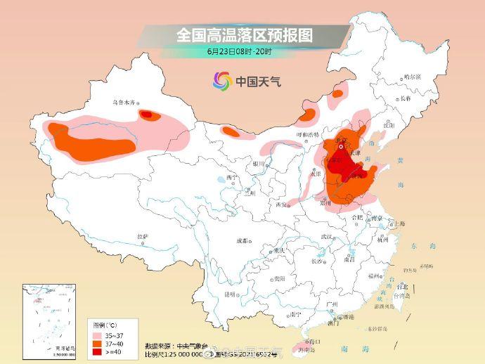 中央气象台6月23日06时继续发布高温橙色预警:预计6月23日白天,华北、黄淮等地将继续出现35℃以上的高温天气,其中,北京、天津、河北、山东、河南北部和东部等地最高气温有37~39℃,北京、天津、河北中南部、山东北部等地的部分地区最高气温可达40℃左右;此外,新疆吐鲁番和南疆盆地、内蒙古西部和中部偏北地区等地也有35~38℃的高温天气,吐鲁番局地最高气温可达40℃左右。