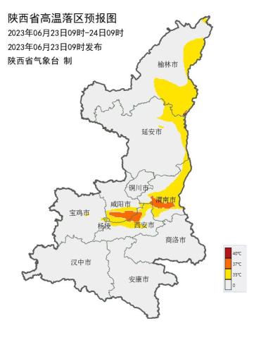 陕西省气象台2023年06月23日09时30分发布高温蓝色预警:受偏北气流影响,预计23日,咸阳南部、西安部分、渭南大部、杨凌、宝鸡中部局地、陕北黄河沿线有35℃及以上的高温天气,其中咸阳南部局地、西安北部局地、渭南南部局地可达37℃以上。24日,咸阳南部、西安部分、渭南部分有35℃及以上的高温天气,局地可达37℃以上。后期25日-27日关中平原仍有35℃及以上的高温天气,局地可达38℃以上。