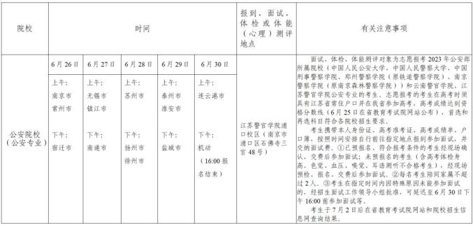 2.凡高考时具有江苏省常住户口并在我省参加普通高考,志愿报考公安院校(公安专业)且符合报考条件的考生,须于6月26日6:00至30日16:00,携带本人身份证、高考准考证、高考成绩单、户口簿等前往江苏警官学院浦口校区(南京市浦口区石佛寺三宫48号),参加由省公安厅与公安院校共同组织的面试、体检和体能测评。请考生登录省教育考试院网站或相关院校招生网站查询具体安排。