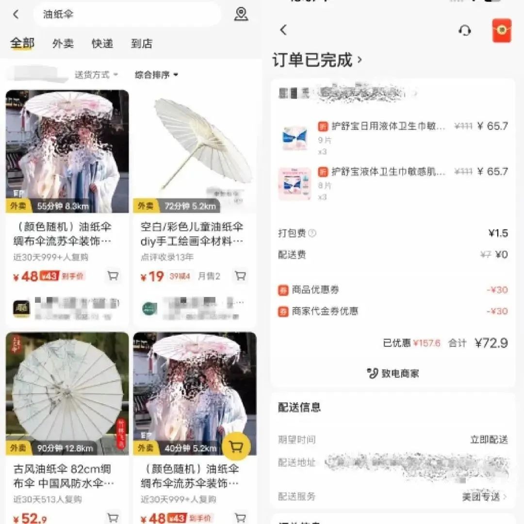 图/舞蹈室同学通过美团外卖搜索“油纸伞”产品(左)毛毛通过美团外卖购买的屈臣氏卫生巾产品(右)