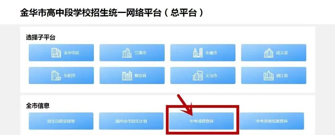 考生可通过登录“金华市高中段学校招生统一网络平台”(网址为:zk.jhzhjy.cn),点击进入“中考成绩查询”查询中考成绩。