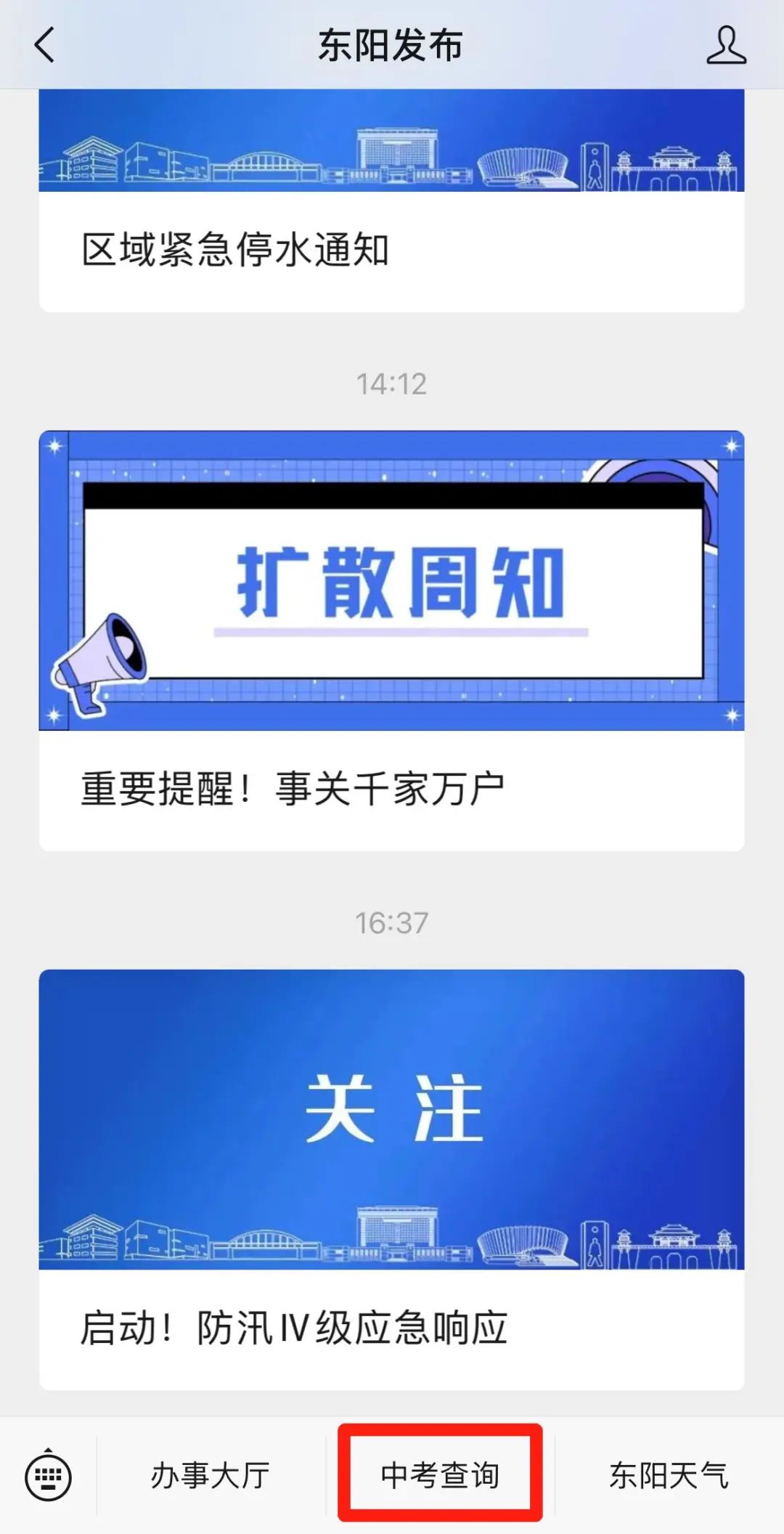 返回“东阳发布”微信公众号主页面,点击下方“中考查询”菜单,进入查询页面。