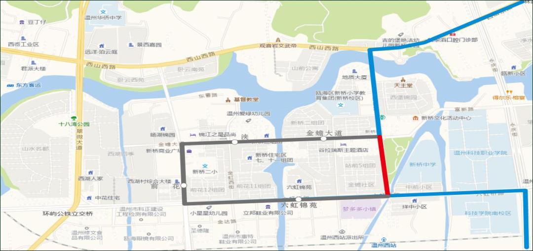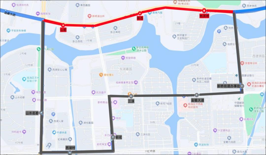 临时撤销站点:山水名都(往行)、西湖村(往行)、前花(往行)、三浃(往行)、金蟾大道(往行)、新桥街道办事处(往行)