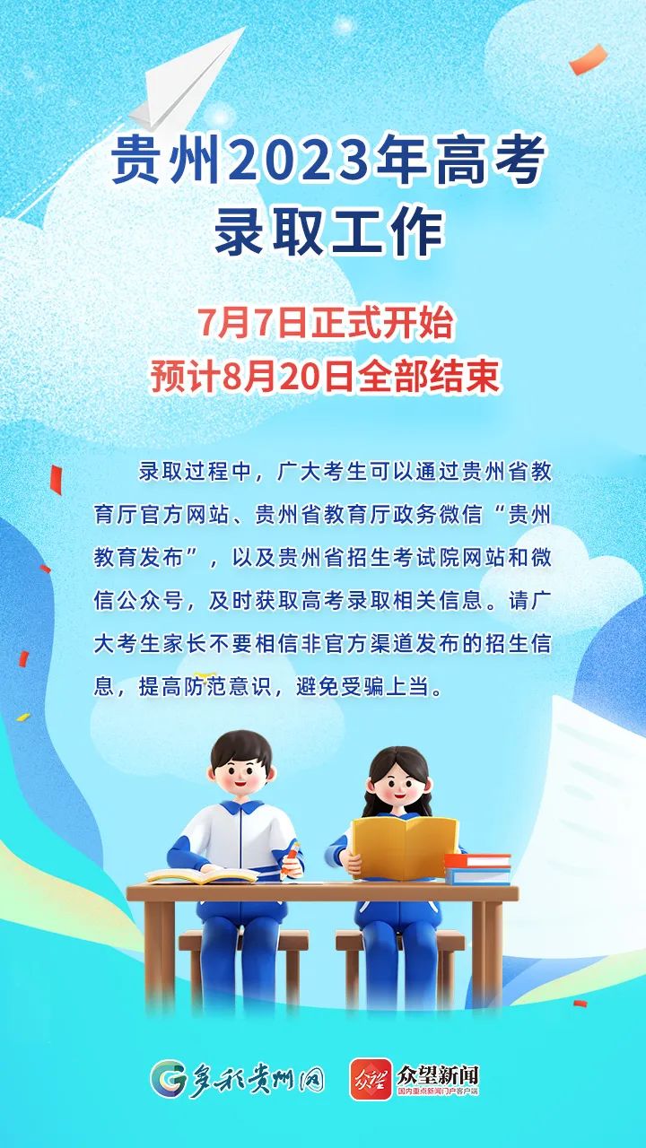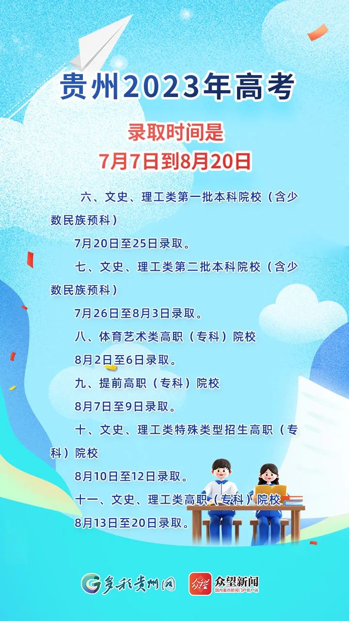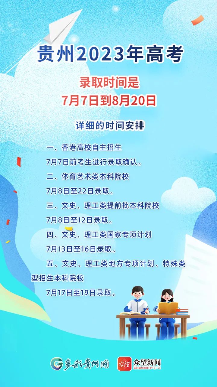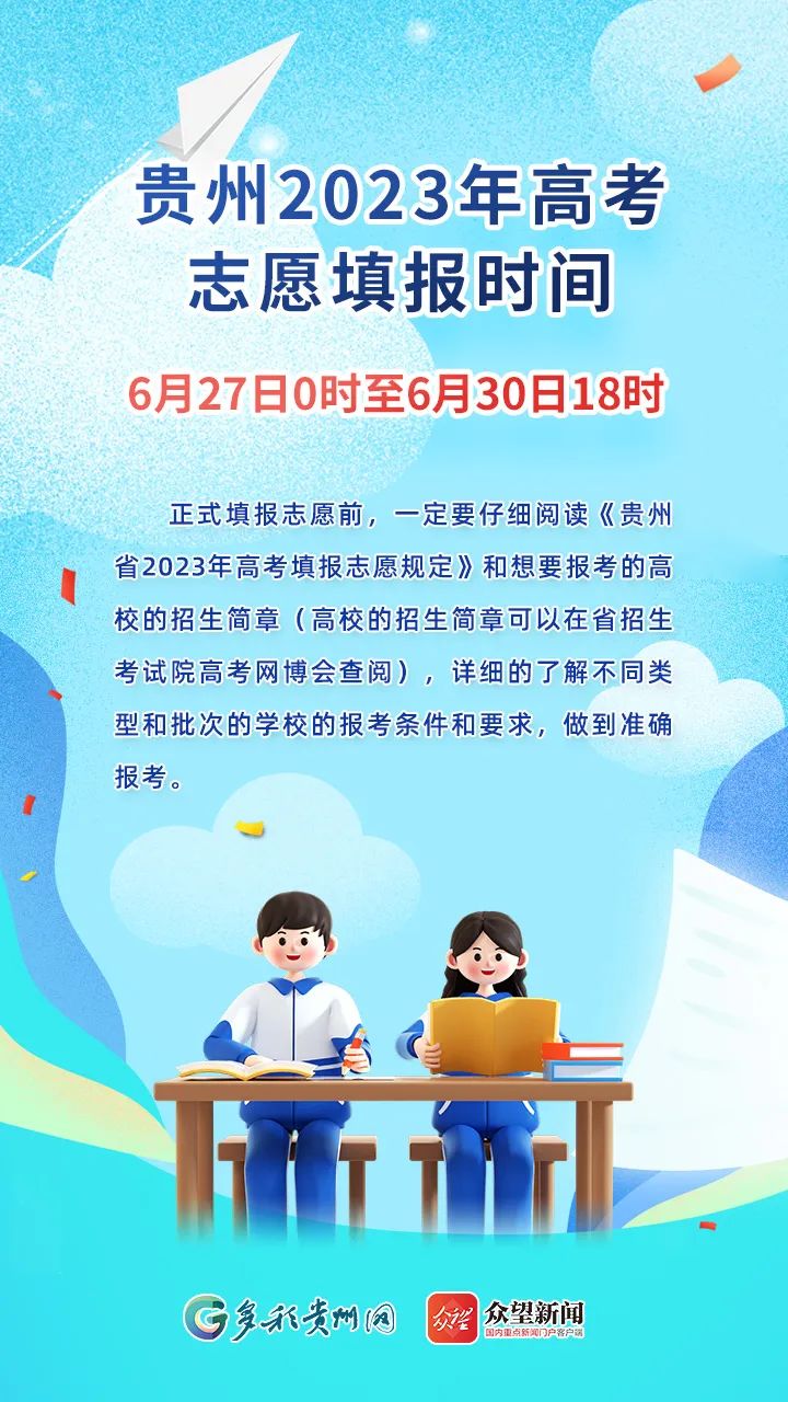 2023年贵州省高考录取所有科类、所有批次志愿均须在6月27日0时至6月30日18时填报。高考录取工作将于7月7日正式开始,预计8月20日全部结束。