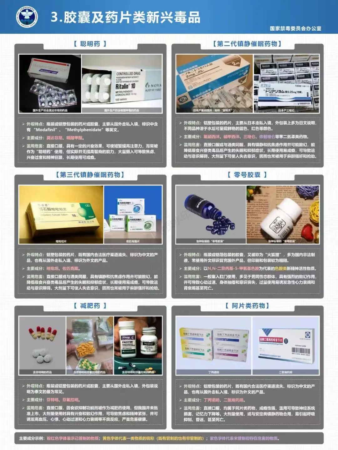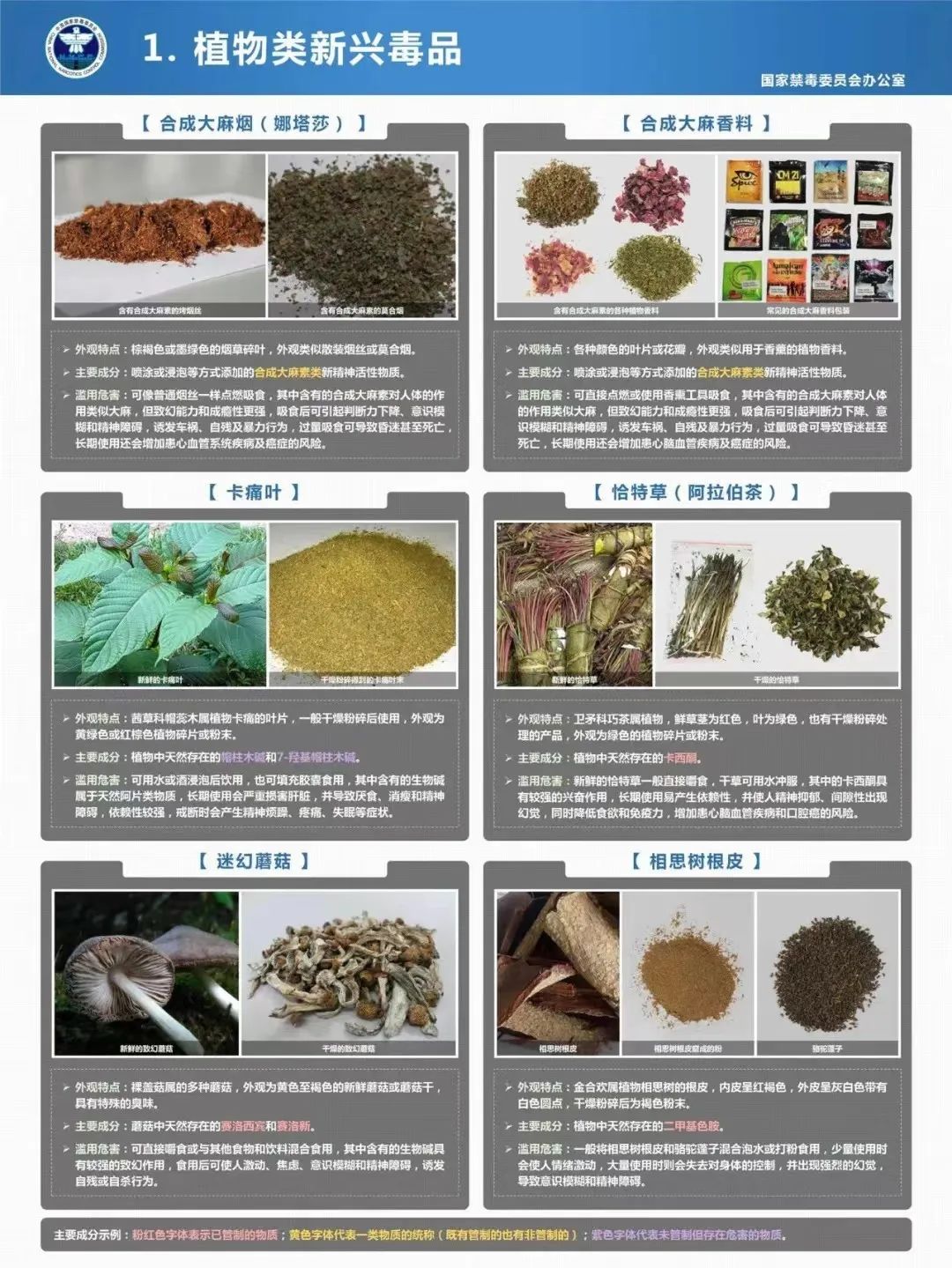 新型毒品:《2022年中国毒情形势报告》中指出:海洛因、冰毒等滥用品种仍维持较大规模,大麻吸食人数逐年上升,新精神活性物质滥用时有发现,花样不断翻新,包装形态不断变化,出现了伪装成食品饮料的“毒糖果”、“毒奶茶”等新型毒品。同时各地查处滥用杜冷丁、安眠酮等管制药物,吸食含合成大麻素、“笑气”等替代物品情况增多。