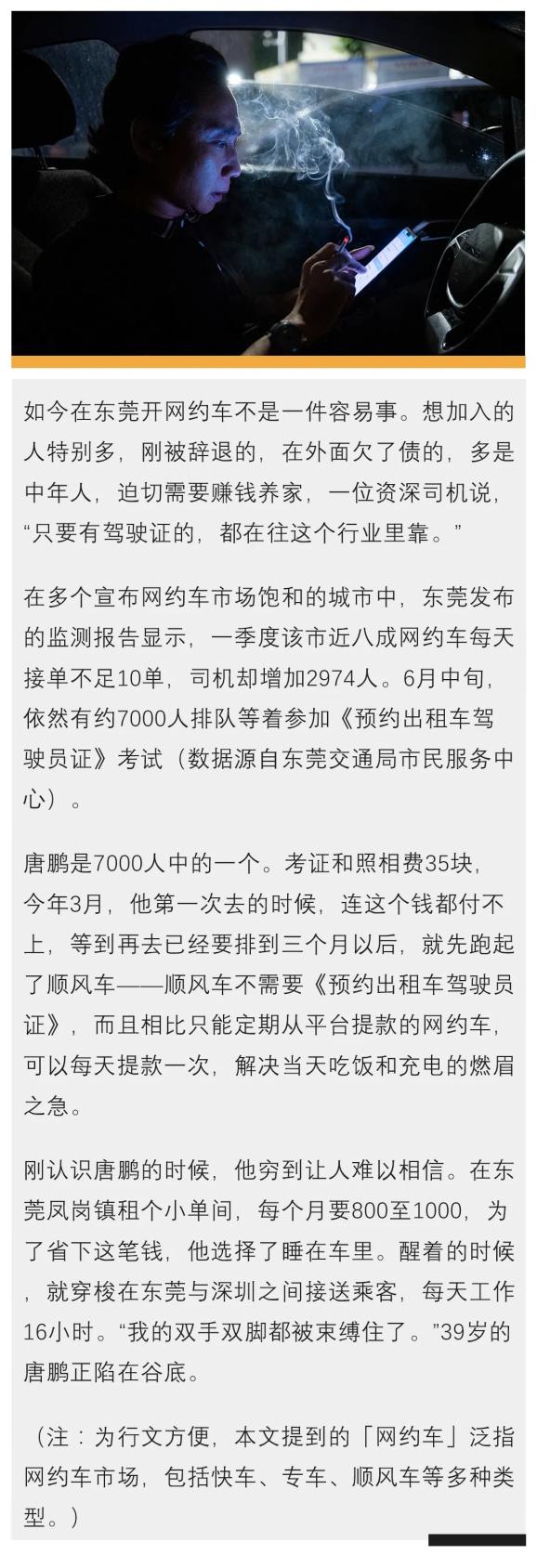 今年一季度,东莞有近八成网约车每天接单不足10单,唐鹏却挤进了这个市场,把日收入目标定在了500块以上。以盈利为目的开顺风车目前处在灰色地带,多名司机介绍,网约车利润越来越薄,大家都是多个平台同时抢,抢到哪个是哪个。