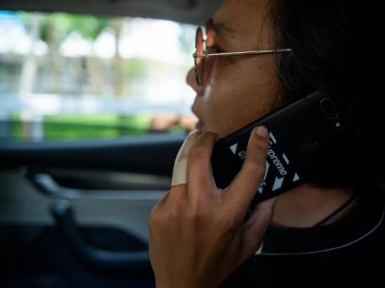 ●唐鹏给乘客打电话确定位置。2005年刚毕业时,一次在工厂工作的意外事故,唐鹏手指被砸断,很难再进厂做流水线工作。今年初,唐鹏带着2000块钱再次来到深圳,找了家一百块钱一晚的小旅馆,每天投简历,找工作,却处处碰壁。很多公司得知他39岁,没有了回复。