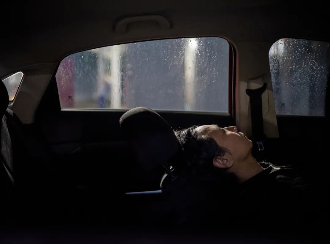 ●车充电时,唐鹏在车里小憩。凌晨两点多是唐鹏通常的收车时间,回到充电站的一个小时,是他这一天里少有的轻松时刻,他会把车熄灭,下车伸伸腰,从后备箱里拿着洗漱用品去公用的卫生间洗漱换衣服,回到车上看一看手机视频。