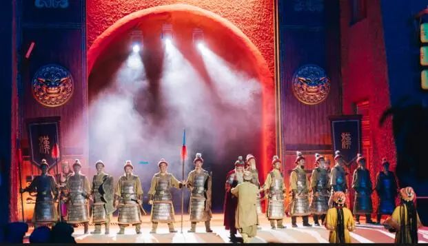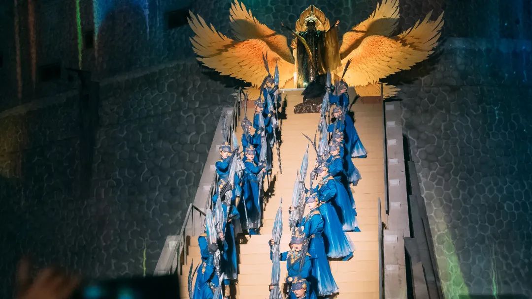 图片出自拍摄《凤鸣开城》作为第一篇章,前奏如同暴风疾雨般的鼓点,伴随号角长鸣,城墙上投影骤亮。