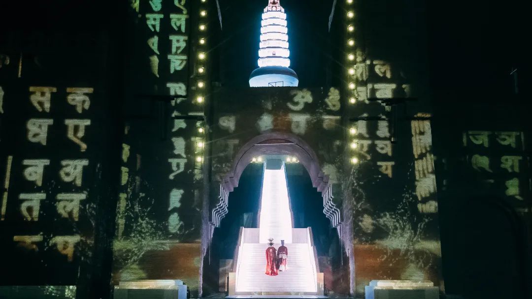 梵音袅袅,象征着玄奘、法显带来的佛教文化从城墙上的佛卷中剥离而出,星光追随二人而来,驱散夜晚的黑暗。