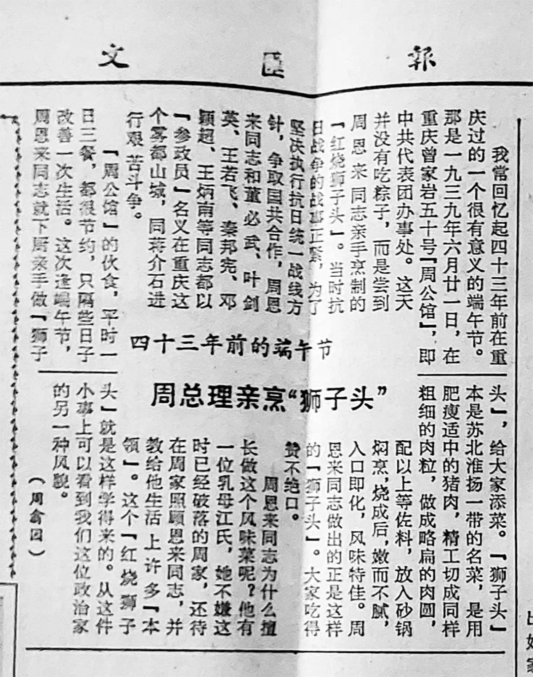 1939年,爷爷从上海经过云南开远抵达重庆,在重庆曾家岩50号“周公馆”即中共代表团办事处,担任周恩来的秘书工作,并整理了周恩来从绍兴带到重庆的周家家谱。根据爷爷回忆,周公馆的伙食,平时一日三餐都很节约,刚巧那年6月21日端午节,周总理亲手下厨,烹制了一道苏北淮扬名菜——红烧狮子头,给大家改善伙食。烧成后,嫩而不腻,风味特佳,大家吃得赞不绝口。爷爷也过了一个非常有意义的端午节。