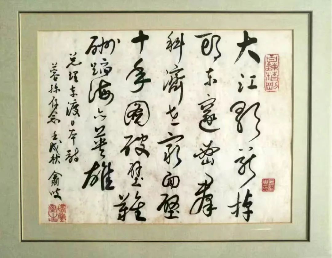 爷爷留给我的唯一一张他的书法作品是周恩来的诗:“大江歌罢掉头东,邃密群科济世穷。面壁十年图破壁,难酬蹈海亦英雄。”爷爷特意写上“蓉孙留念 壬戌秋”(1982年秋),右边图章上是“百炼精钢”。原来我一直以为这只是爷爷许多书法作品中的一份,只是因为有我的名字我才视为宝贝。随着时间的推移,我越来越明白了爷爷的用意。爷爷之所以选择1982年秋写给我,是因为这首诗是周恩来19岁东渡日本所作,而1982年我正19岁。爷爷是希望我能以七爷爷周恩来为榜样,他以这样的方式留给我了一份世代传承的精神纽带。
