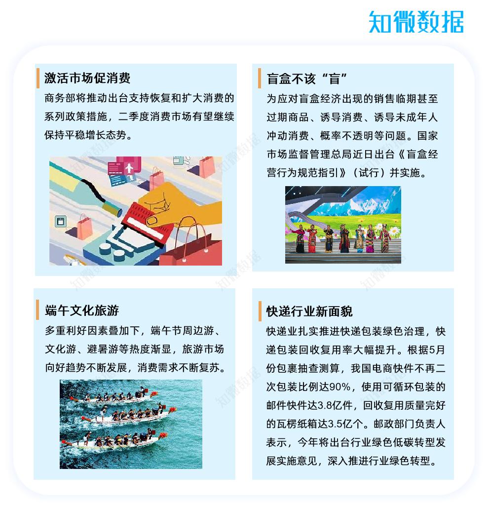 本周,新消费舆论场宏观热议内容中包括:激活市场促消费、端午文化旅游、盲盒不该“盲”、快递行业新面貌。与此同时电竞赛事、动漫节、5G游戏等新消费模式也在舆论场宏观热议中出现。