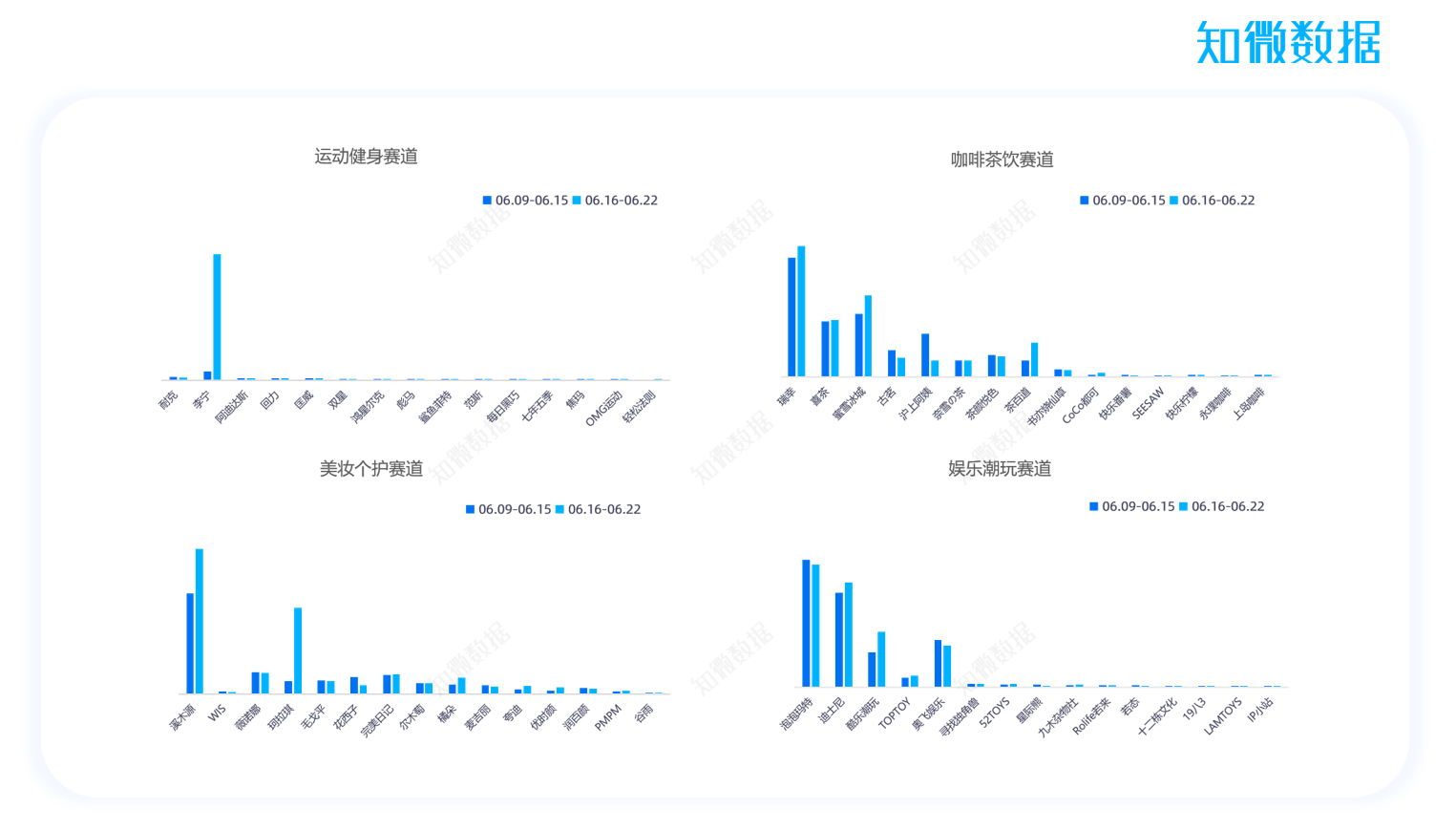 赛道方面,本周运动健身声量最高。咖啡茶饮及美妆个护赛道紧随其后。