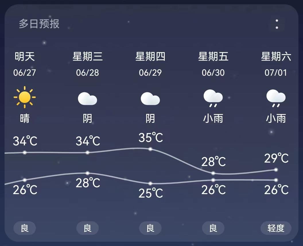 26日20时至27日20时,全省晴天间多云,湘西南、湘南局地有阵雨或雷阵雨;南风2~3级;最高气温33~35℃;最低气温22~24℃。