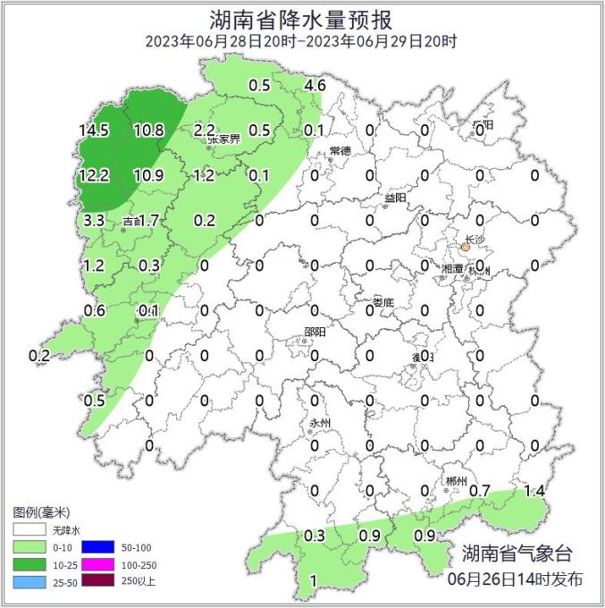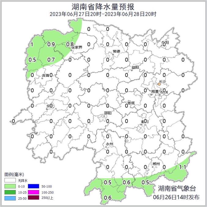湖南省气象台预计,未来一周湖南降雨北多南少,27日开始高温发展,29日至7月2日湘西、湘北还有一次局地暴雨到大暴雨过程。26日强降雨过程趋于结束,湘南局地有大雨。27日至28日,全省以晴天间多云天气为主,湘西、湘南多阵雨或雷阵雨。29日至30日,湘西、湘北部分地区有大到暴雨,局地大暴雨。7月1日至2日湘西北局地有大到暴雨。