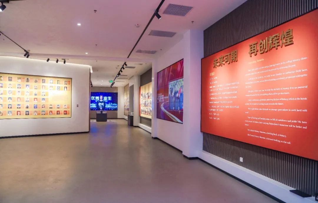 洛阳职业技术学院校史馆位于图书馆二楼北侧,面积约900平方米,包含140平方米的大型三彩壁画和700余平方米的展厅两部分。共分为“根植河洛 源分八脉”“汇溪成河 扬帆高歌”“百舸争流 教泽流芳”“殷殷期盼 桃开李绽”四大板块,通过大量详实的文字、图片、实物和多媒体史料,全方位、多角度、深层次地展示了学校延续70余年的发展历程,客观记述了学校在人才培养、教育教学、社会服务、文化传承等方面所取得的发展成就,凸显了学校在不同历史时期为豫西地区经济社会发展所做出的突出贡献。