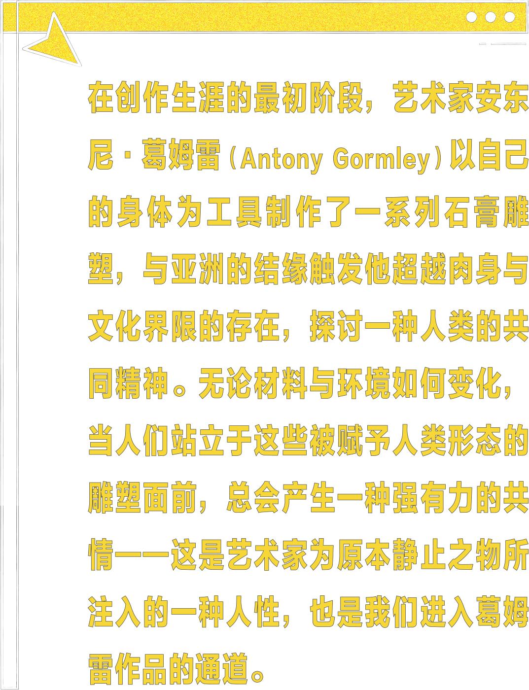 “在一个晴朗的夜晚,或者当你闭上眼睛的时候,你能体验到一个无限广阔的黑暗空间,那里不存在物体和时间。某种程度上,这是我一生都在研究的主题。”葛姆雷说。他选择用雕塑来琢磨这个主题,并且在这条道路上越走越坚定。1994年,葛姆雷凭借作品《大不列颠岛的土地》(Field for the British Isles,1993)成为当年透纳奖的得主。之后,当时英国最大的雕塑《北方天使》(The Angel of the North,1998)于纽卡斯尔落成,葛姆雷因这件著名公共艺术品越发受到国际艺术界广泛关注。