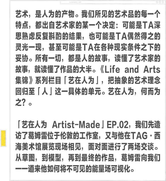 “你说他们会通过社交媒体来看展?噢,那简直是灾难。”他说,“我想让观众觉察到自身在空间中的运动。我希望我的作品能帮助观众调整他们在时空中的旅程。”