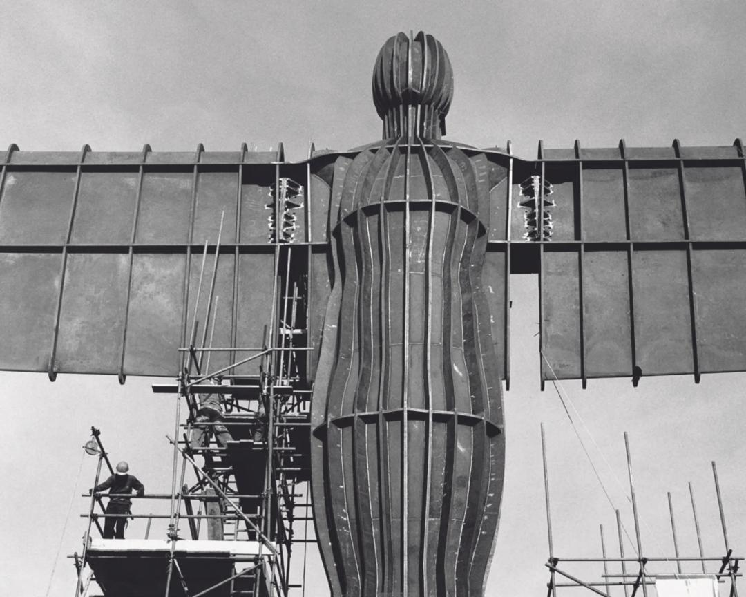 上:《北方天使》,1998年,铁,20×54×2.20米,位于英格兰小镇Gateshead的永久装置;下:《北方天使》的制作过程,1998年。