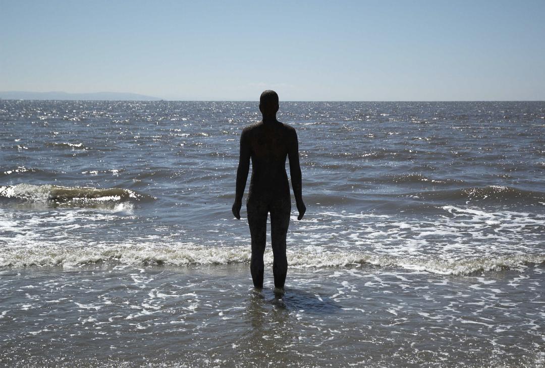 另一个地方(Another Place),1997,铸铁,189x53x29cm(共100个),在位于英国的小镇Crosby的展示现场图片由Stephen White & Co拍摄,©Antony Gormley
