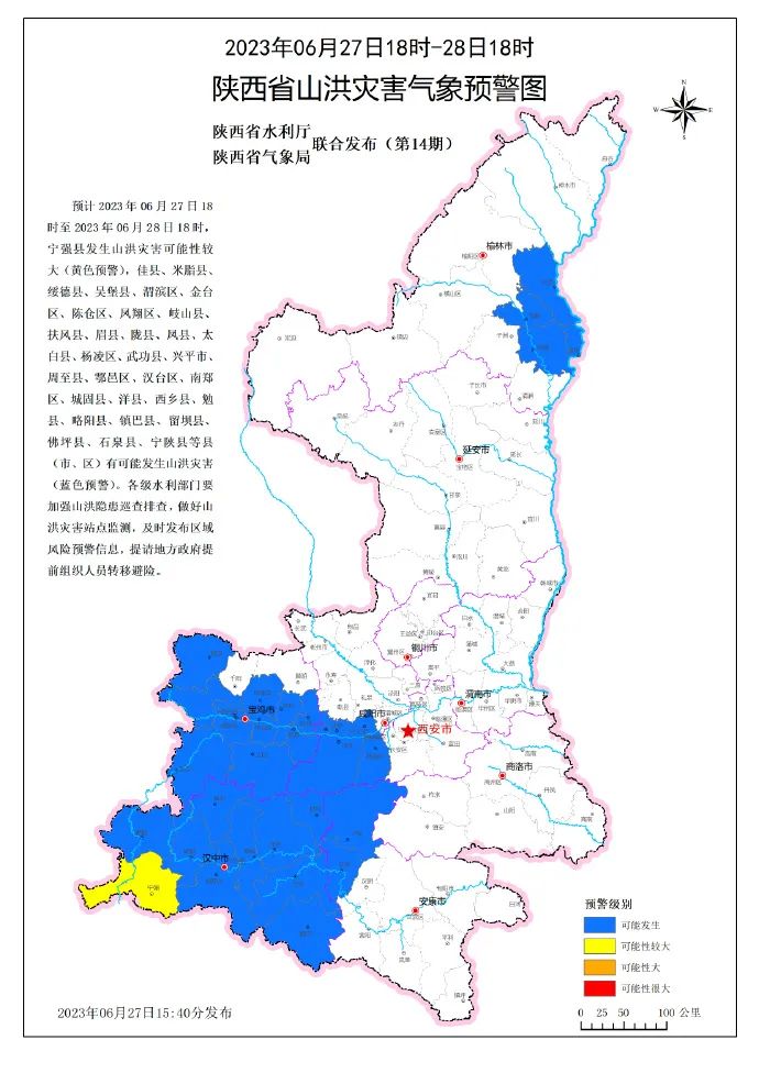预计2023年06月27日18时至2023年06月28日18时,宁强县发生山洪灾害可能性较大(黄色预警),佳县、米脂县、绥德县、吴堡县、渭滨区、金台区、陈仓区、凤翔区、岐山县、扶风县、眉县、陇县、凤县、太白县、杨凌区、武功县、兴平市、周至县、鄠邑区、汉台区、南郑区、城固县、洋县、西乡县、勉县、略阳县、镇巴县、留坝县、佛坪县、石泉县、宁陕县等县(市、区)有可能发生山洪灾害(蓝色预警)。各级水利部门要加强山洪隐患巡查排查,做好山洪灾害站点监测,及时发布区域风险预警信息,提请地方政府提前组织人员转移避险。
