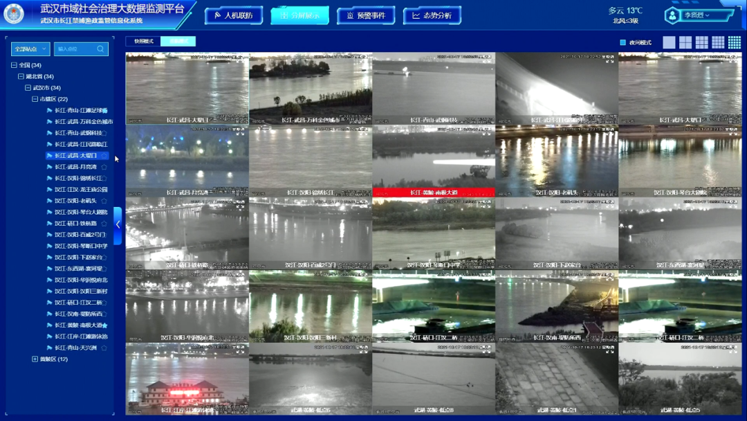 按照市级先行建设,区级分步实施的思路,通过加密补盲布点,增配无人机,市级新增22个高点,统筹全市153个高点,将多种前沿感知设备、智能技术、平台系统全面打通,形成“全覆盖、可视化、立体式”的沿江视频监管体系,确保禁捕水域全景“看得清”,禁渔执法处置“说得清”,区域事件“查得清”。天网工程依托部署在长江、汉江的高点视频,充分利用高清探头、红外监测、激光补光等先进前沿技术,通过无人机进行空中巡查、重点补盲,辅助配备高倍电子望远镜、夜视仪等单兵手持装备,有效实现24小时全天候不间断执法监管。在24小时观测跟踪时,天网工程对违法行为施以AI智能预警,实时分析违法捕捞、违规垂钓等行为,实现自动发现、自动预警、导航定位、事件调度、人员处置、案件处理全流程机制。在这样的机制下,天网工程会将预警事件反馈至渔政执法信息子系统,最终帮助渔政指挥人员在指挥中心进行实时调度指挥,极大地提高禁捕行动的效率。