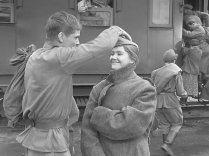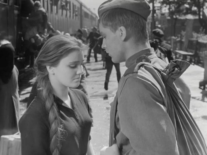 《士兵之歌》(Ballad of a Soldier,1959,苏联)是电影绝唱,苏联没有了,银幕上也再没有那样的苏联男孩和女孩。卫国战争期间,十九岁的阿廖沙用军功换来一个假期。将军一共给他六天时间,来回路上四天,帮妈妈俢屋顶两天。虽然是战争期间,阿廖沙的心却是晴朗的。他一路助人为乐也接受生命馈赠,火车上遇到舒拉,整个世界刹那安静,只有风只有树只有你。可惜,美好的事物总有一个“但是”跟在后面,最美好的就有一个最大的“但是”,第四天送别舒拉,尽管他们根本不需要对彼此说一句“我喜欢你”,但匆忙的假期确实也没给机会让他们说出那句话。最后一天抵达家乡,阿廖沙只剩十分钟时间,“妈妈,我马上得走。”他和母亲在稻田中挥别,“妈妈,我会回来的。”