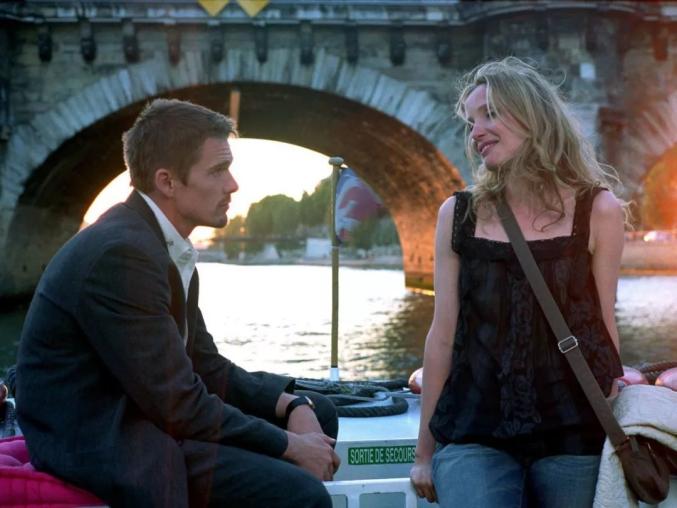 不过,对于从来没有足够寒假的华师大人来说,也不要轻生,因为电影史也提供了另外一种方法论。简单说,没有足够长,如果足够短,也有万千可能。《爱在》三部曲,《爱在黎明破晓前》《爱在日落黄昏时》《爱在午夜降临前》,第二部最好。《爱在日落黄昏时》(Before Sunset,2004,美国)延续了第一部的风格、剧情和男女主人公,九年后,美国人伊桑和法国人朱莉再次在法国相遇,岁月流逝,当年巨大的错失也能用三言两语间说清,生命之重风淡云轻拍下来,这是林克莱特的能力。伊桑现在是畅销书作家,来法国签售,下午的活动,傍晚的飞机,他们只有一下午的时间。
