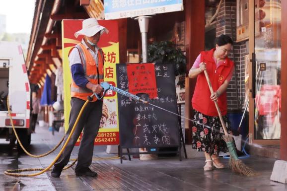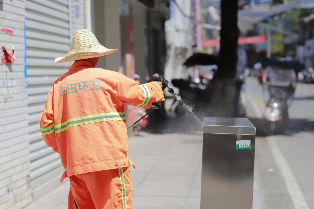 6月28日,一群“环卫橙”在青云社区志愿者配合下,正顶着烈日清扫清洗青云美食街路面。环卫工人们采用“人机配合”的模式对美食街路面进行清洗,清除道路污迹油迹,对美食街内垃圾桶、果壳箱进行循环冲洗,对沿路发现破损的垃圾箱进行及时更换,消除视觉污染,净化城市环境。“青云美食街建成后,在县城市管理局等部门的帮助指导下,在光大绿色环保再生能源(古田)有限公司的大力支持下,美食街的环境得到了很大的改善。”青云社区党支部副书记吴邦联说道。