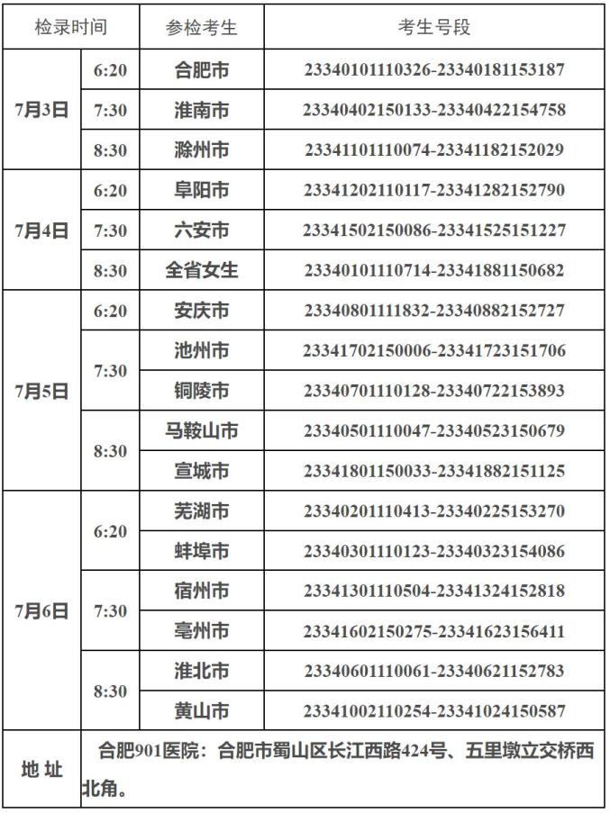 面试体检(心理测试)于7月3日至7月6日(各设区市考生具体参检时间详见附表)在合肥市联勤保障部队第901医院统一组织,全省女生统一于7月4日参加面试体检(心理测试)。考生参检时需携带本人身份证、准考证、《军队院校招收普通高中毕业生面试表》和《病史调查表》(附件1、2,考生自行下载并填写基本信息)。