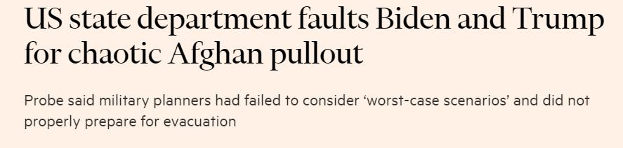 美国国务院的最新报告指出,特朗普和拜登两届政府的撤军决定“对阿富汗政府的生存能力及其安全造成了严重后果”,并指责两届政府的“高层没有充分考虑最坏的情况以及这些情况可能以多快的速度发生”。