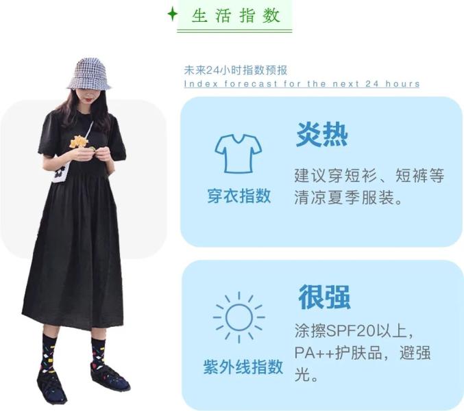 本周高温维持在35℃左右,午后太阳辐射较强,应尽量避免高温时段户外活动,清晨或傍晚天气较凉爽,外出活动场地可选择在河湖水边、公园庭院等空气新鲜的地方。锻炼项目以散步、慢跑、太极拳、广播操为好,切忌运动过激引起中暑。