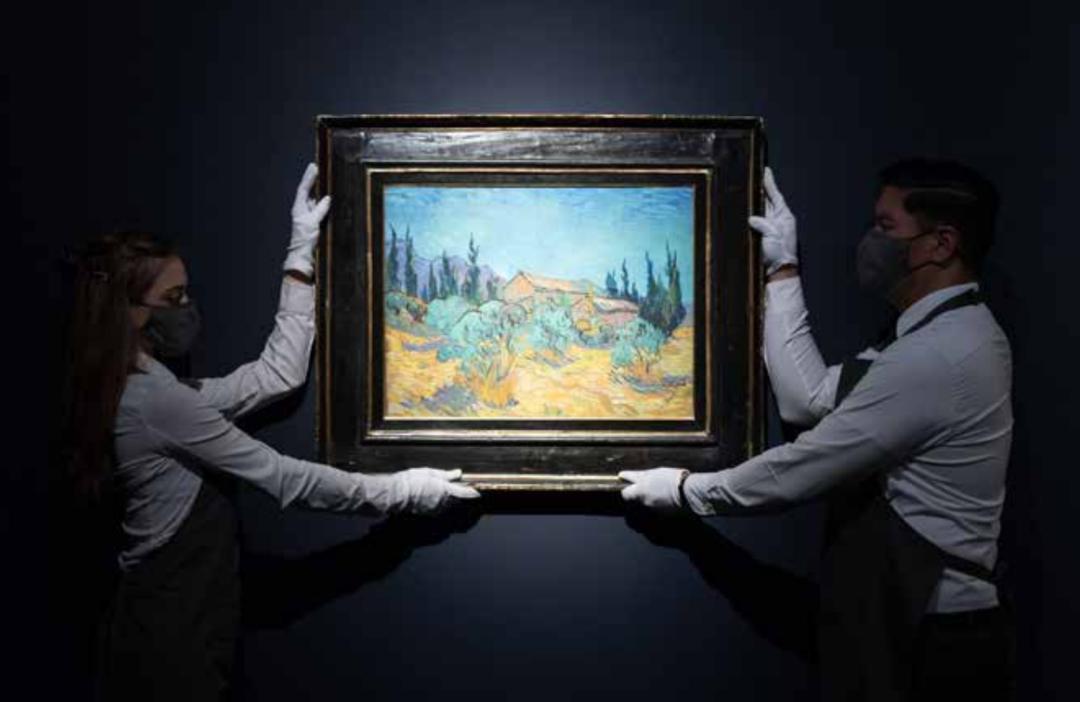 2021年10月18日,佳士得纽约秋拍专场“考克斯珍藏:印象派的故事”精选拍品于伦敦巡展,工作人员正在展示梵高创作于1889年的《橄榄树和柏树间的木屋》。该画最终在纽约拍出天文数字般的价格——7135万美元(约合人民币4.56亿元)唯一的《红色葡萄园》