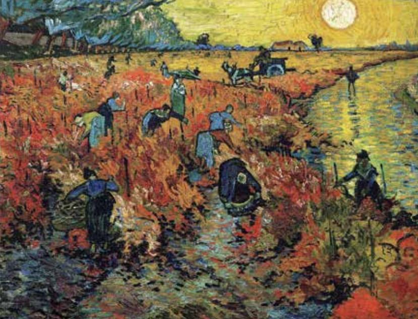 这幅“唯一”的画作,就是《红色葡萄园》。1888年10月28日,梵高与另一位著名画家保罗·高更(Paul Gauguin)在傍晚散步时偶然发现了一座葡萄园。后来,梵高描述自己目睹的葡萄园场景:一片红色的葡萄园,像浸润在红葡萄酒中。在远处,它逐渐变黄,直至黄绿色的天空中悬挂一轮太阳,夕阳反射在雨后的田野,到处闪现着紫色和闪闪发光的黄色。