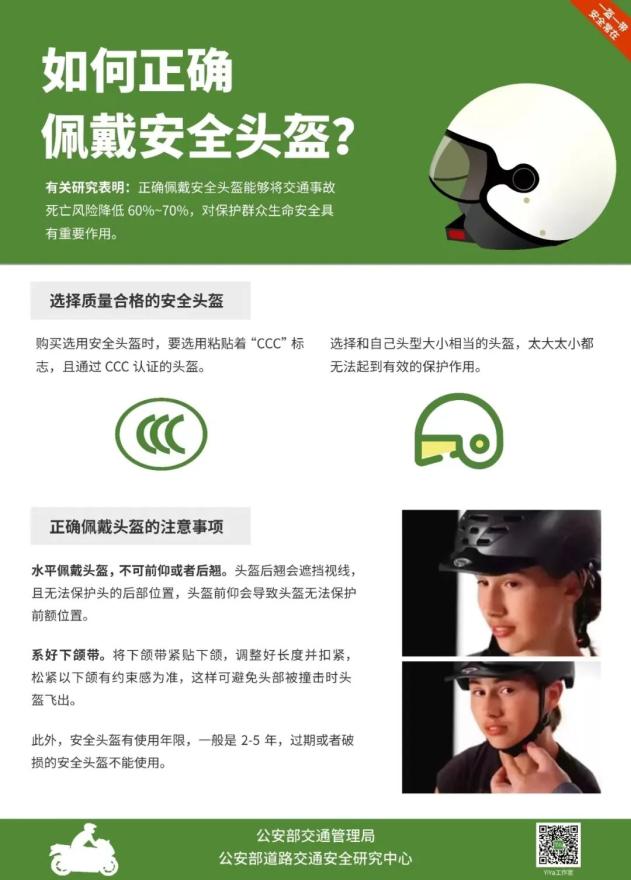 佩戴安全头盔是安全骑行的必要保护措施,骑行或乘坐电动自行车需要正确佩戴安全头盔,以保护头部,降低事故伤害程度。