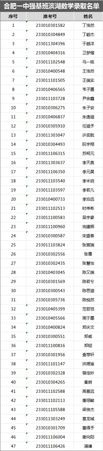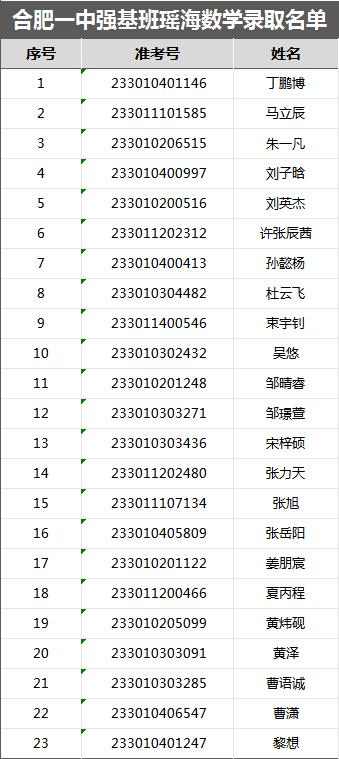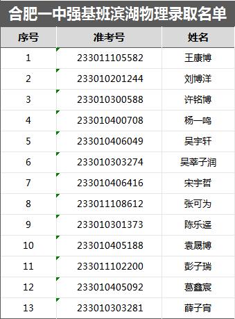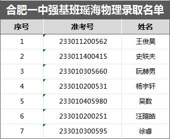 根据《合肥六中2023年强基实验班招生方案》,按综合成绩由高到低确定录取考生名单,录取的考生不用填报中考志愿。公示时间:2023年7月5日-7月7日。如有异议,可在公示期间内电话反映,电话:0551-62853666。