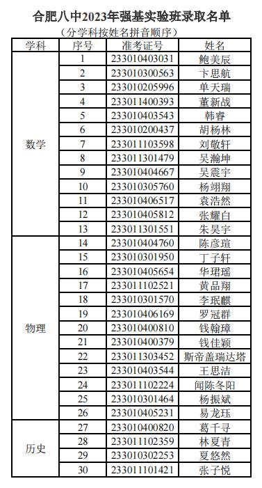 合肥八中今年提前批次招生30人,其中数学13人,物理13人,历史学4人。