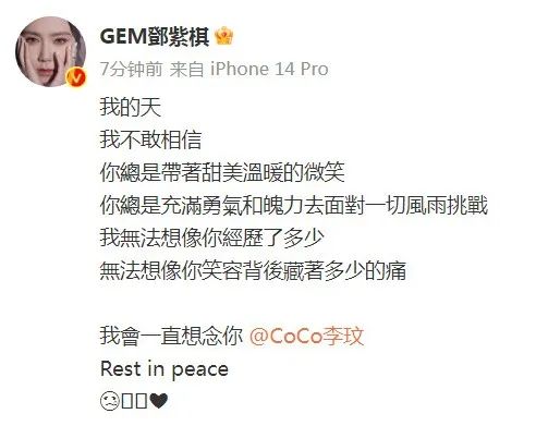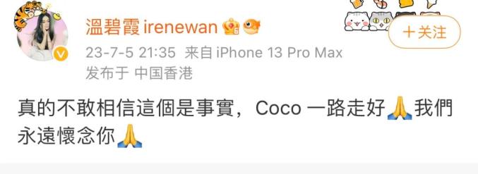 @中华玟迷联盟 曾发布过一条coco的语音留言,其中说“感受到大家对我的爱跟支持,你们做我的后盾,我会加油,这段时间希望你们自己也身体健康快乐,我非常想念大家我在努力努力,想念你们,我也非常想念你们哦,爱你爱你!” 而这条微博发布的时间,正是7月2日……