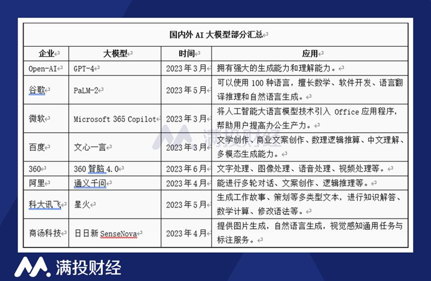 从国内外AI大模型的发展来看,仍以Open-AI的 GPT系列大模型为代表;GPT大模型经历了GPT-1、GPT-2、GPT-3、GPT-3.5( ChatGPT的模型 )等多个版本的持续优化,目前最新的GPT-4在参数、逻辑能力、准确性方面都有了更大的提升。谷歌今年5月份发布的通用大语言模型PaLM-2,据悉在语言方面呈现的能力对标GPT-4。微软发布的AI助手Microsoft 365 Copilot,镶嵌至Office应用程序,带来更智能、更高效的办公体验。