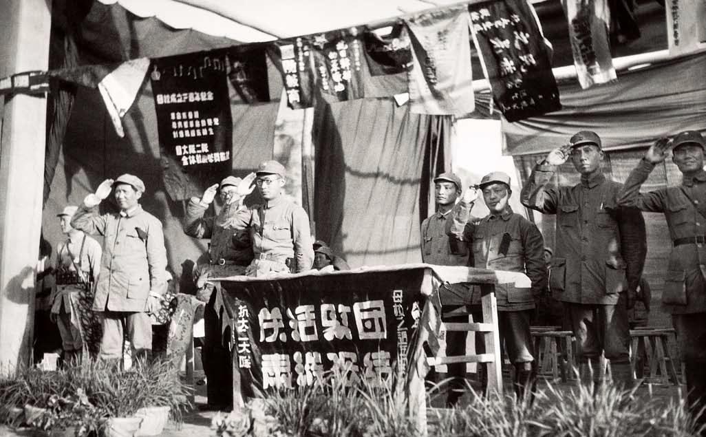 △ 1939年6月1日,陈云出席中国人民抗日军政大学建校三周年纪念会并发表讲话。图为大会主席台。左起:毛泽东、张闻天、王稼祥、陈云、王明、刘少奇、邓发。