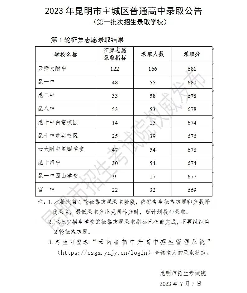 原标题:《2023年昆明中考第一批次第1轮征集志愿录取线揭晓》