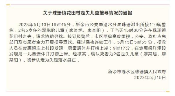 ● 5月15日,江西省新余市渝水区珠珊镇人民政府发布通报称:2023年5月13日15时30分许,2名5岁多的双胞胎儿童(廖某旭、廖某阳)在珠珊镇花田村走失。经核实,确认2名走失儿童因失足落水身亡 。