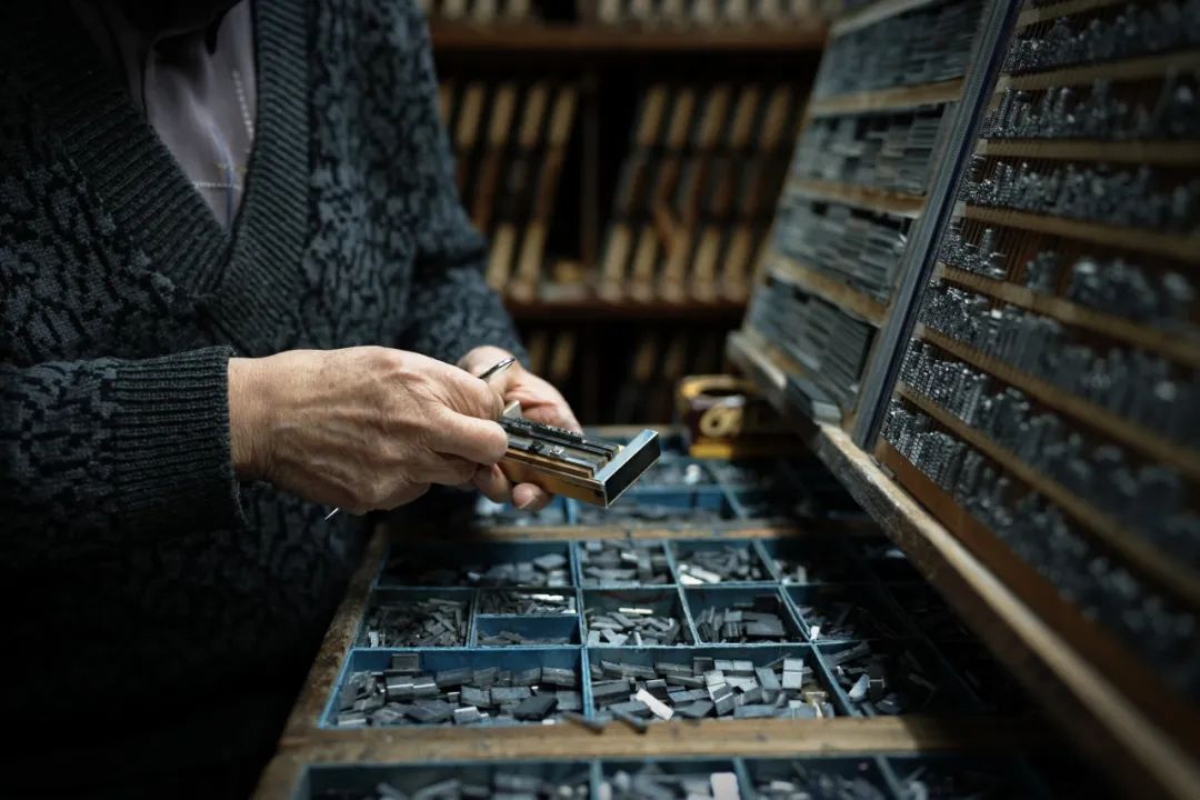 字模、铸造、检字、排版、印刷——每个部门都有一位六七十岁的工匠不声不响地埋首于自己的工作。见识过凸版印刷的大型胶印轮转机运作景象的溪山,当下有一种时代倒退的错觉。